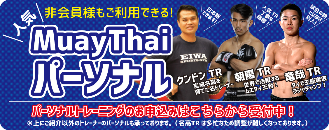 ご本人様の意志があれば本場タイの名門出身トレーナーが親身に指導します。現在、エイワスポーツジムには世界チャンピオンや日本チャンピオン、日本ランカーなどの強豪ムエタイ選手が多数在籍しています。初心者の方でも一緒の空間で練習し意識を高めアマチュア大会参加からプロムエタイ選手になれます。また、エイワスポーツジムでは、本場タイ興行へ出場する選手の支援も積極的に行っています。プロライセンスの取得やタイ遠征などの充実した環境をサポートいたします。本気でプロ選手として活躍したいならエイワスポーツに一度お越しください!まずは体験して雰囲気をご覧ください!