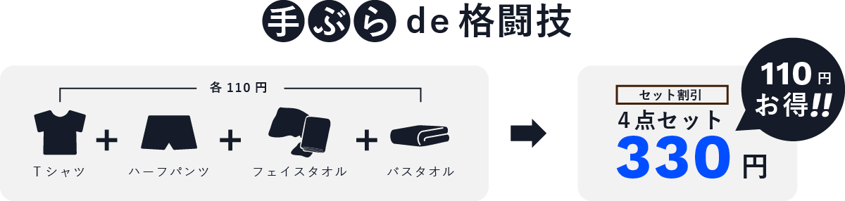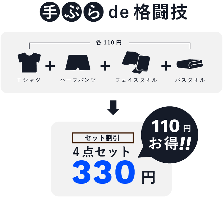 レンタル4点セット(Tシャツ・パンツ・フェイスタオル・バスタオル):330円