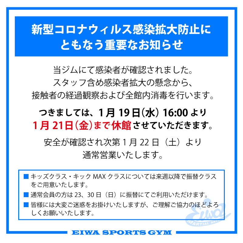 新型コロナウィルス感染拡大防止にともなう重要なお知らせ 2022.01.19