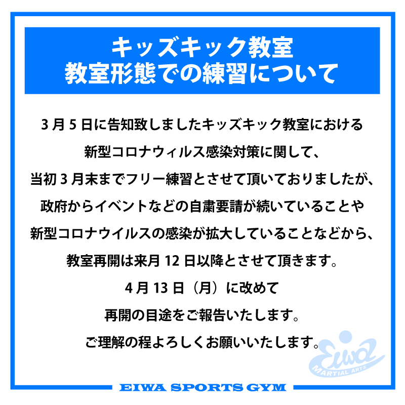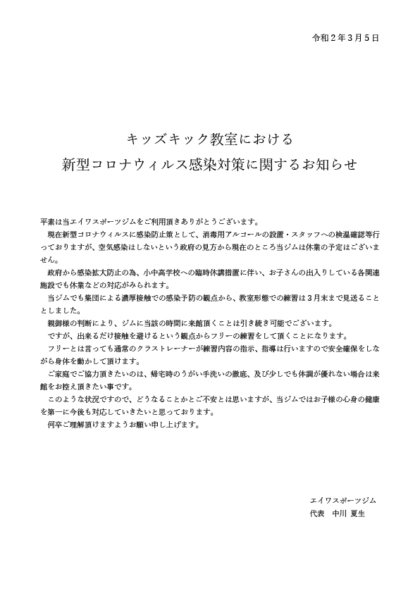 キッズキック教室における新型コロナウィルス感染対策に関するお知らせ 2020.03.09