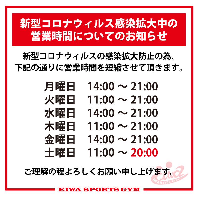 政府の緊急事態宣言を受けて 明日より上記の通り短縮営業を始めます。 2020.04.07